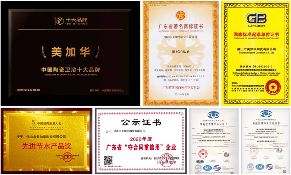憑借優(yōu)異的產(chǎn)品質(zhì)量和完善的售后服務(wù),美加華多次獲得“中國陶瓷衛(wèi)浴十大品牌”、“廣東省著名商標(biāo)”、“先進(jìn)節(jié)水產(chǎn)品”、“廣東省守合同重信用企業(yè)”等殊榮,并作為國家標(biāo)準(zhǔn)起草單位,為中國衛(wèi)浴產(chǎn)業(yè)做出貢獻(xiàn)。