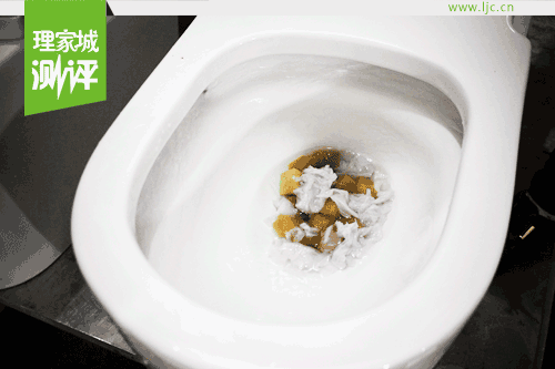 現(xiàn)場小編用玻璃屑、100個聚丙烯球一個管道球、海綿紙巾模擬各種排泄物進行了沖水試驗,在漩轉(zhuǎn)瀑布水流、優(yōu)良陶瓷管道的配合下,噴射式水流瞬間將玻璃屑、高爾浮球、海綿紙巾等堵塞物吸走,沖力十足。