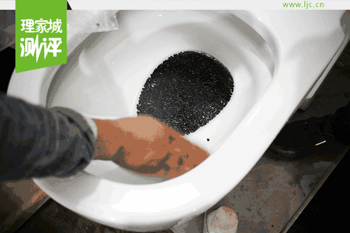 小編現(xiàn)場倒入65克的PE顆粒進行測試,黑色顆粒鋪滿排污口,按下沖洗開關(guān)后,隨著出水口強勁水流的沖刷,混合顆粒瞬間吸走。